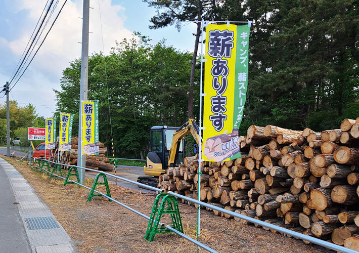 ロードサイド案内として、のぼり旗を複数本並べて設置して頂いております、黄色が特に色鮮やかにプリントされ、「薪あります」の文字がとても良く目立つ仕上がりです!