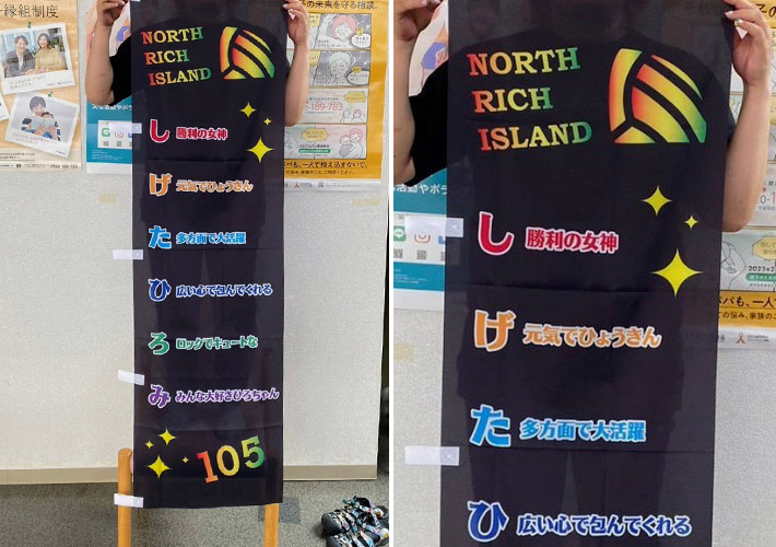 定番のw600xh1,800mm、生地は薄手のテトロンポンジにてのぼり旗を制作しました。2種デザインののぼりで集合写真も華やかになっています!