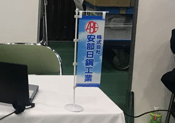 定番生地にダイレクト印刷を施しています。屋外使用のイメージが強いのぼり旗ですが、このように屋内の説明会や相談会などの集客にもご活用頂けます。