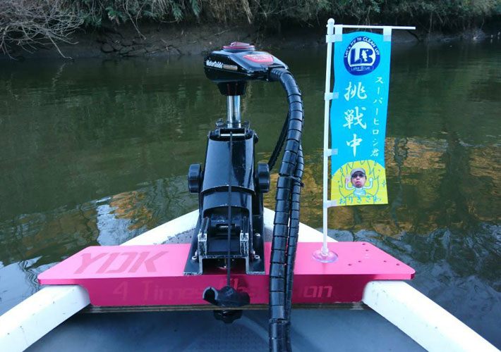 w90×h270mmの中盤サイズとなるミニのぼり旗と吸盤タイプの取付パーツをご注文頂き、船上にミニのぼりを取り付けて頂いています。