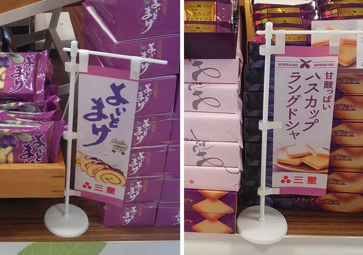 商品名や商品写真が入った2種デザインのミニのぼり旗を製作しました。店内各所に設置することで、一押し商品を効果的にアピールすることが可能です!
