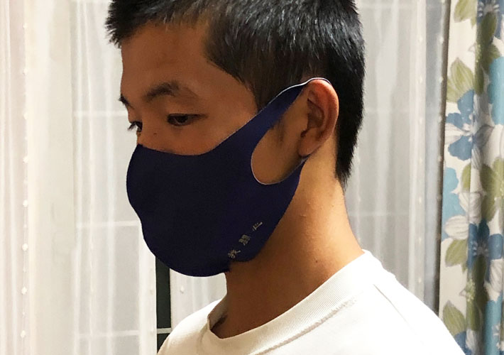 国内一流生地を使った冷感マスクに、濃紺の全面ベタ地印刷と黄色の文字入れを行いました。さりげない文字入れがかっこいいマスクになっています!