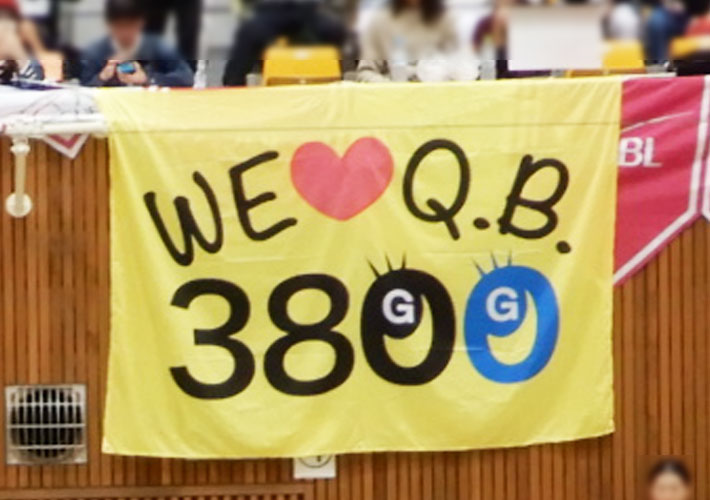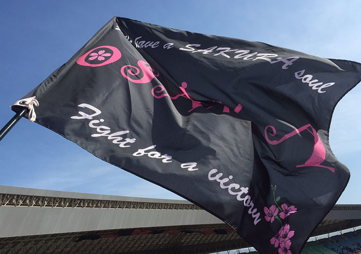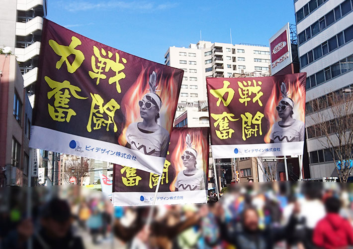 薄手で軽量なテトロンポンジ生地にフルカラー印刷を施し、w2,200×h2,000(mm)の応援旗を製作しました。観客席で黒地の旗がよく目立ち、大型サイズなので存在感も抜群です!