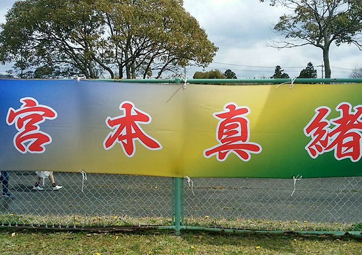 寄せ書きの裏移りやにじみを軽減させるため、汚れや水をはじく撥水防汚トロマットにて名入れ製作を行った応援旗の制作実績になります。