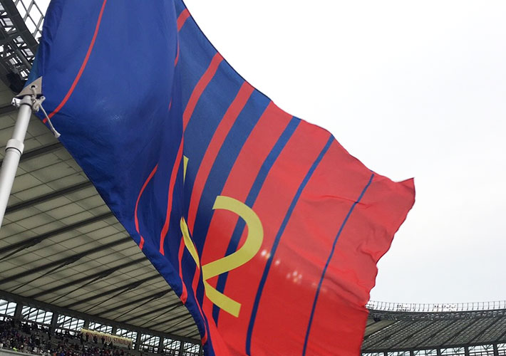 透け感のある薄手のテトロンポンジ生地にデザインを再現いたしました。赤・青・黄色それぞれ発色良く印刷され、スタジアムでも良く目立つ応援旗となっています!