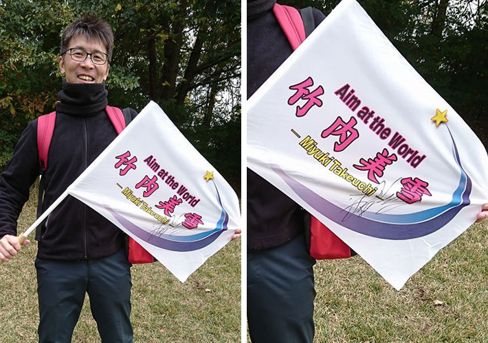 テトロンポンジにダイレクト印刷を施し、お名前のピンク色やロゴのグラデーションも鮮やかに再現いたしました。良く目立つ応援用手旗になっているかと思います!