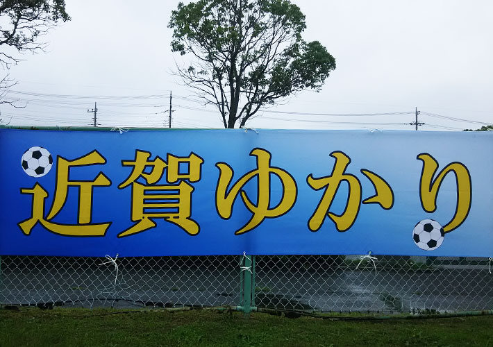 テトロントロマット生地で横断幕を製作しました。黄色でプリントされたお名前がしっかり目立ち、サッカーボールのイラストも綺麗に再現されています!