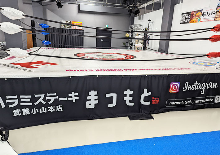 プロレスリングのサイズに合わせてw6,000×h900(mm)にてオリジナル幕を製作いたしました。店舗ロゴや詳細情報を名入れし、大きな宣伝効果が期待できます!