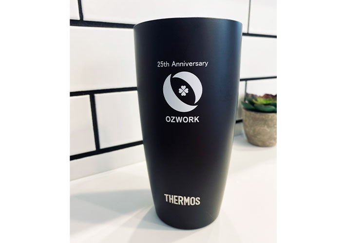 保温マグカップに単色パッド印刷を施し、会社様の周年記念品を作成しました。フタ付きなので温かさが長持ちし、コーヒーブレイクに最適な商品となっております。
