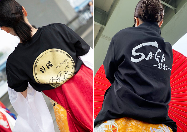 和風デザインでよさこい衣装との相性抜群な、2種のロゴ入りTシャツとチームロゴ入りのブルゾンを制作しました。どちらもチームユニフォーム制作に人気の商品となっております!