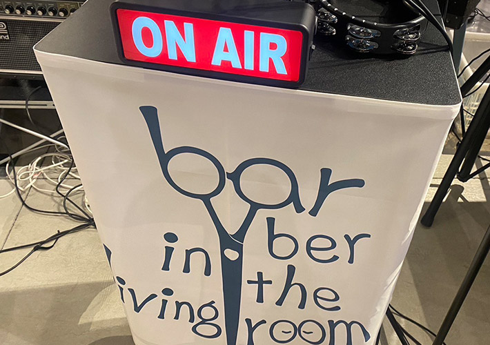 ツルッとした光沢感のあるスエード生地に防炎加工を施しております。全面オレンジ色が明るい印象で、正面には黒・白色を使用した配信プラットフォーム様のロゴとQRコードをプリントいたしました!