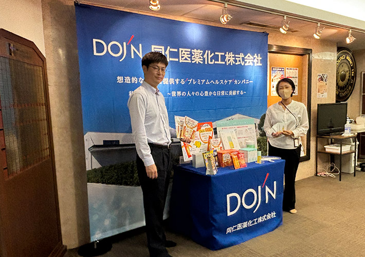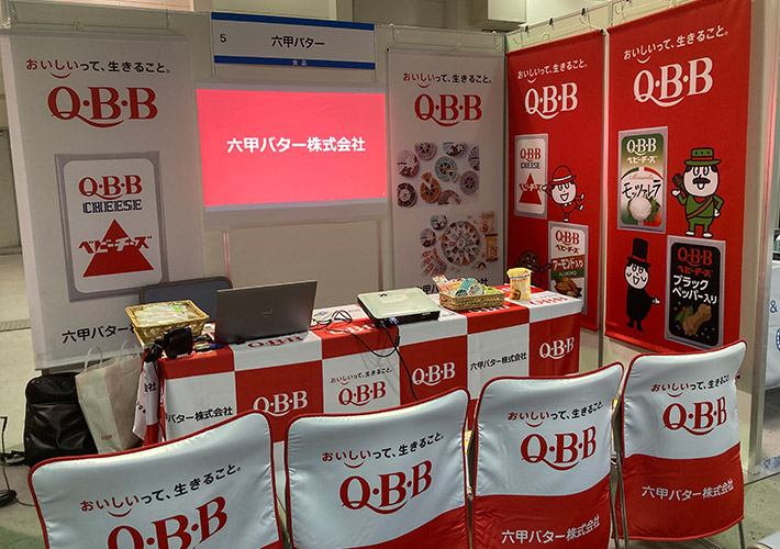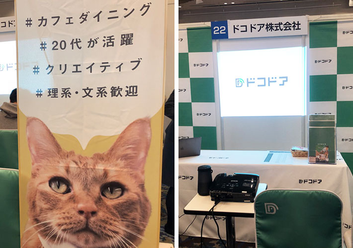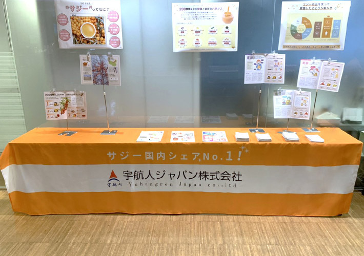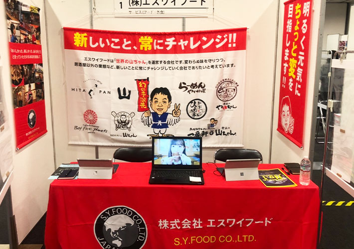 紅白カラーを使ったまとまりのある説明会ブース装飾を作成しました。企業名やブランドロゴ、キャッチフレーズを中心に、タペストリーには商品画像やイラストも使用することで華やかな印象に仕上がっています!
