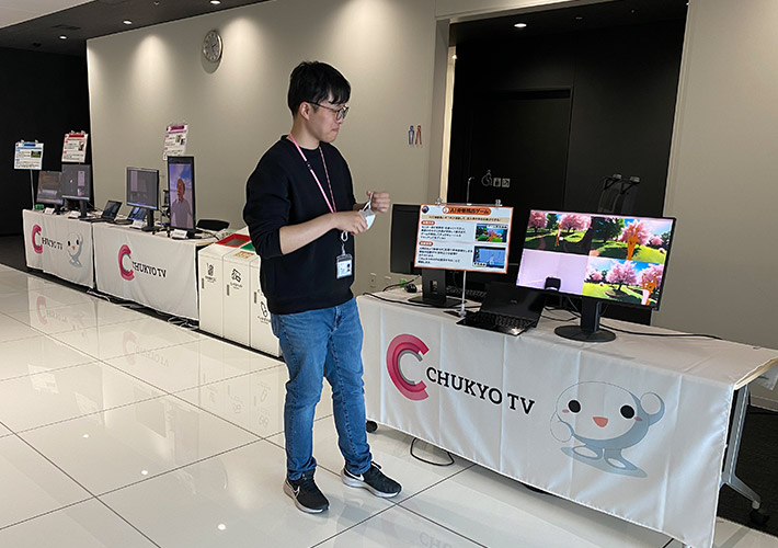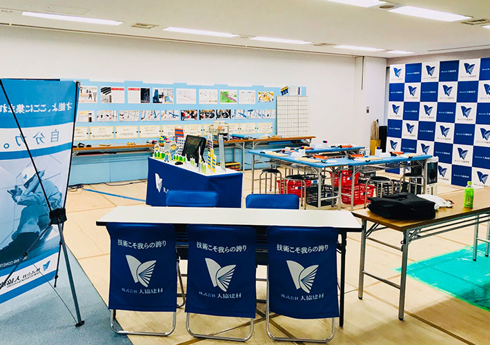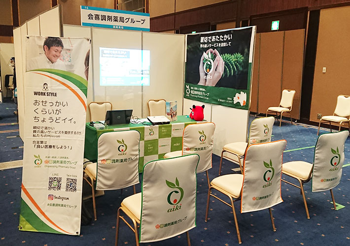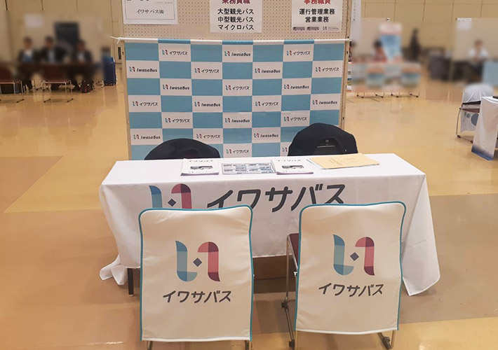 紺色・白色をベースに企業ロゴ・企業名入りのまとまりあるデザインにて説明会装飾を作成しました。どれも防炎加工を施しているので、布製品の防炎加工必須のイベント会場でも使っていただけます。