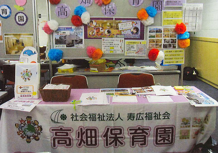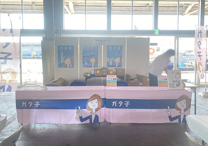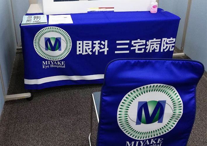 A2サイズの発泡パネル(スチレンボード)はインパクトのある卓上POP・案内板として、サービス内容を記載した青地テーブルクロスはコの字型に設置したテーブルにそれぞれ敷いてご活用いただいております。