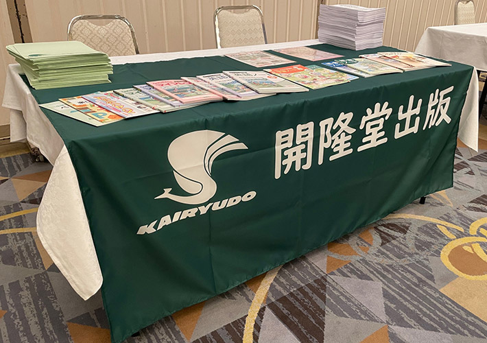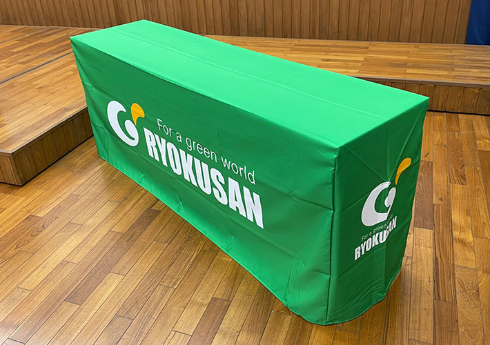 テトロンポンジ生地にフルカラー印刷を施し、緑地の前掛け型テーブルクロスを製作いたしました。白色でロゴマークと出版社名入れを行い、遠くからでもアピール力がありつつ、落ち着いた好印象を与えてくれます。