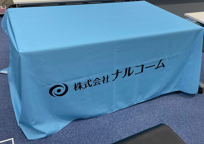 はっきりと鮮やかな青地に、白色・赤色を使ったロゴを名入れプリントしたテーブルクロスです。フラットな一枚布タイプですので、一般的な会議机から大きめのテーブルまで対応することができます!