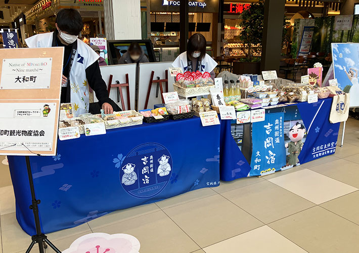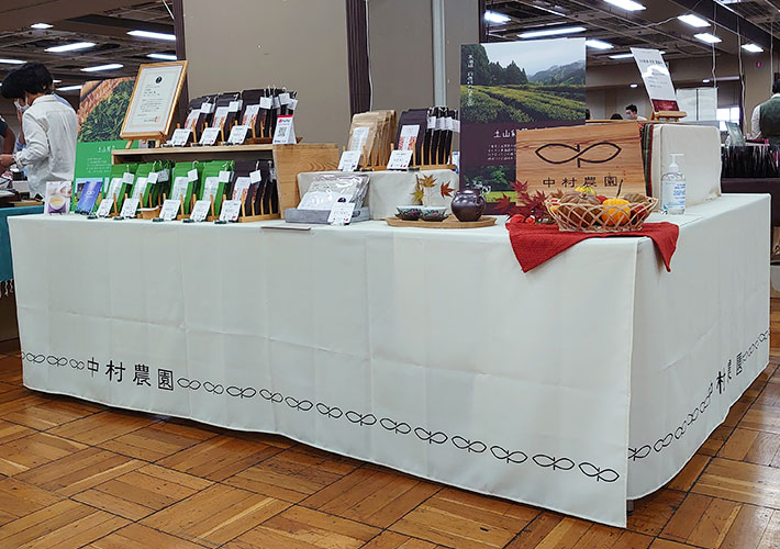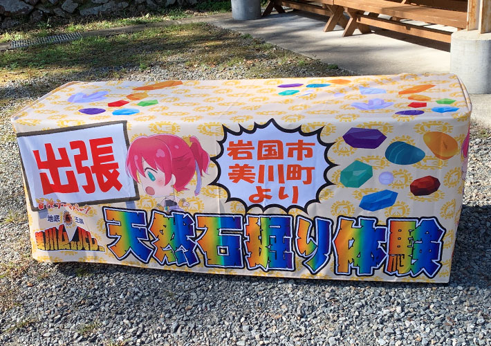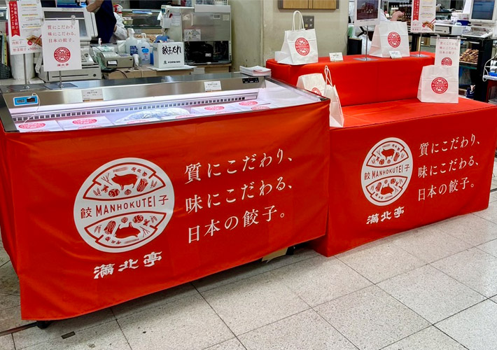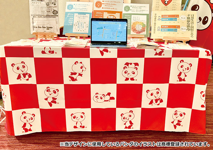 正面・左右面のみを覆う腰幕タイプのテーブルクロスを制作いたしました。お味噌の商品画像が細部まで色鮮やかにプリントされ、販促効果抜群のテーブルクロスに仕上がっております!