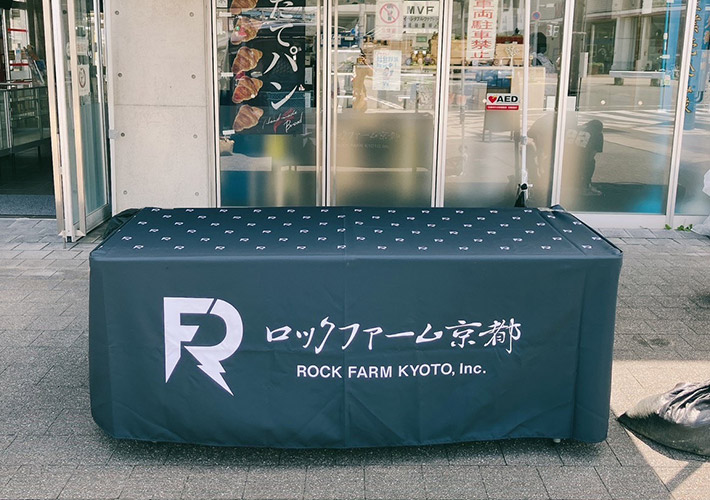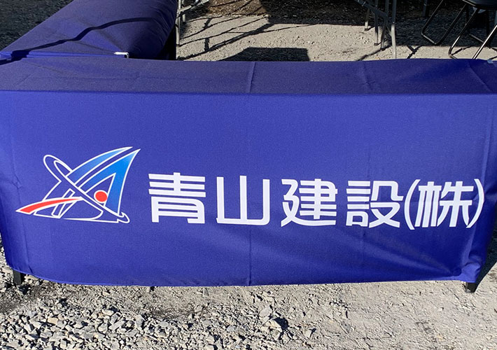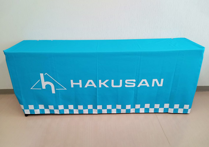 オレンジ色と白色のインパクトのある配色に、正面の社名とコピーが目立つテーブルクロスを作成いたしました。生地には、撥水加工と防炎加工の良いとこどりの化繊生地を使用しております。