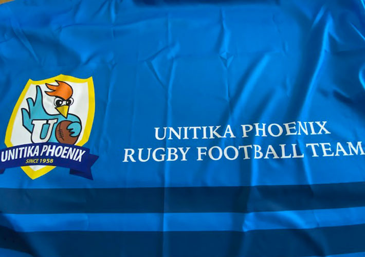 白地で清潔感がありますが、下部の赤と青のデザインがアクセントになり、中央のロゴや大学院名もしっかり目立っています!トロマット生地は中厚で透けにくいので、今回のような白地デザインにお薦めです。