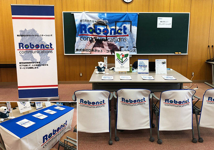 青色のグラデーションと会社ロゴ入りデザインに共通性のあるテーブルクロスと椅子カバー、会社や業務内容のイメージが伝わりやすいタペストリー、3商品のおまとめ注文を承りました。