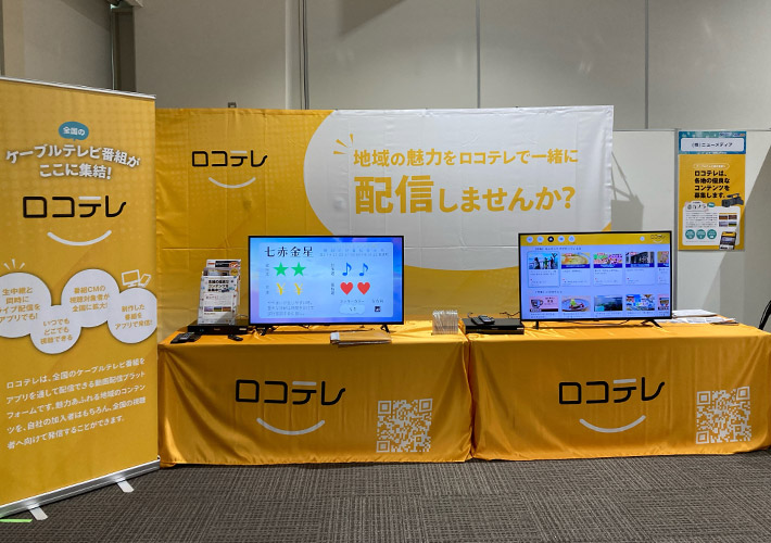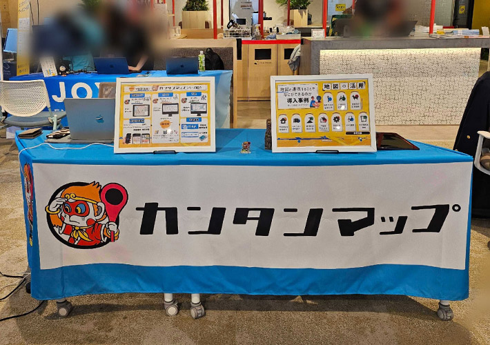 黒色をベースに、サービスロゴやサービス内容の紹介が入った装飾グッズを作成しました。テーブルクロスはシンプルに、バナーやタペストリーは目に入りやすい位置に宣伝デザインを入れたまとまりのあるブースとなっております。