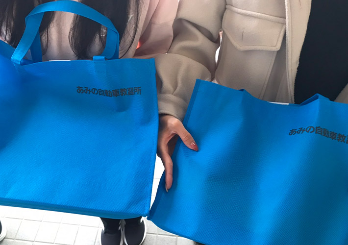 カラフルなスクエア型の不織布バッグにシルク1色プリントを施しました。さりげない名入れデザインは外でも持ち歩きやすく、教習を受けに行く際に活躍します。