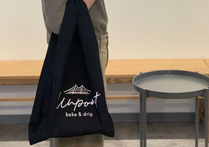 黒1色のシルク印刷を施し、カヌレをモチーフにした繊細なイラストと店舗名をプリントいたしました。温かみがあり普段使いもしやすいおしゃれなバッグに仕上がっています!