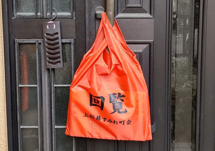町会の回覧板用オリジナルトートバッグを名入れ製作いたしました。「回覧」の文字や町会名が、レッドカラーのバッグによく映えています。