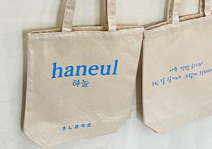 ナチュラルカラーのキャンバスバッグに、爽やかな水色でロゴを印刷いたしました。両面印刷を行うことで、どこから見てもおしゃれなオリジナルバッグに仕上がっています!