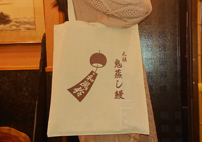 A3サイズも収納可能なコットンバッグに1色印刷を施しました。文字と風鈴のイラストがくっきり再現され、和の雰囲気を感じる仕上がりです!