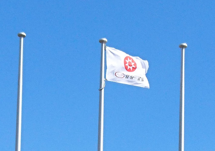 ツイル生地の社旗を、安全旗や国旗と並んでポールに掲揚して頂いております。裏面に反転柄を名入れすることで、裏抜けしているような仕上がりです!