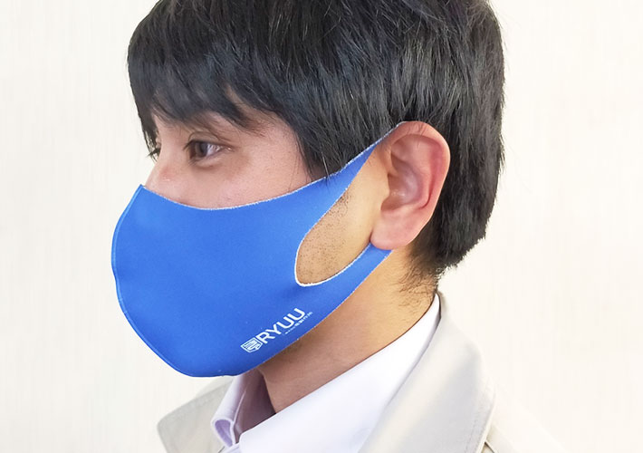 呼吸がしやすい立体型のふんわりフィットマスクに全面印刷を施しました。耳に掛ける部分まで青色がプリントされ、左面の白色ロゴも綺麗に映えています!