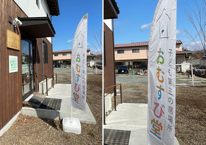 テトロンポンジ生地に昇華転写印刷を施し、上部が湾曲したのスウィングバナーを制作いたしました。白地が清潔感抜群で、カラフルな施設名やかわいいロゴ入りで親しみやすい雰囲気が魅力的です!