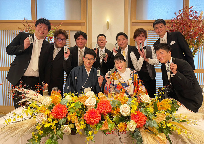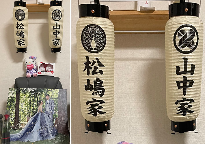 手に持っても飾っても存在感を発揮する中太弓張提灯に、ご両家のお名前と家紋を名入れして結婚式の小道具としてご活用いただきました!
