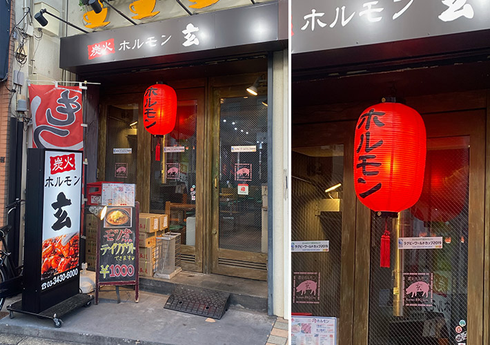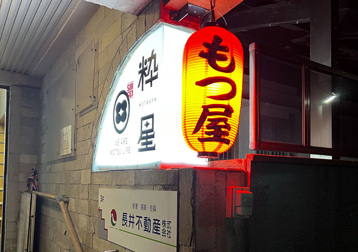 赤色提灯に職人お任せの黒文字で手書き名入れを施し、味のある提灯に仕上がりました。夜間は特に訴求効果を発揮し、もつ屋店様の存在をしっかりアピールしています!