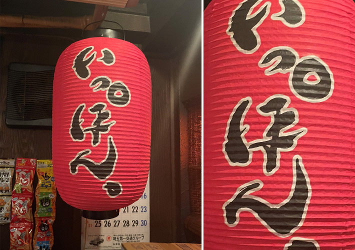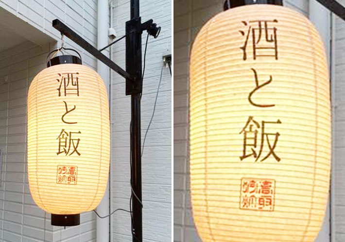 存在感のある15号丸型ビニール提灯に手書き名入れを行い、店舗様のロゴをオリジナル制作いたしました。黒い線に白いフチを付けることで、より目立ちやすい提灯となっています!