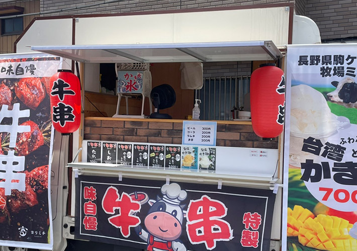 賑やかで活気ある印象の赤色提灯を2つご注文頂き、キッチンカーに取り付けてご活用頂いております。「牛串」の名入れで、看板メニューをアピールできるオリジナル提灯です!