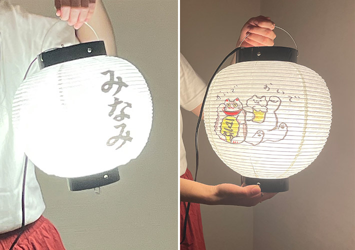 プレゼント用のオリジナル提灯として、正面に文字入れ、背面にかわいい招き猫のイラストをプリントした温かみのある丸型和紙提灯を製作しました。