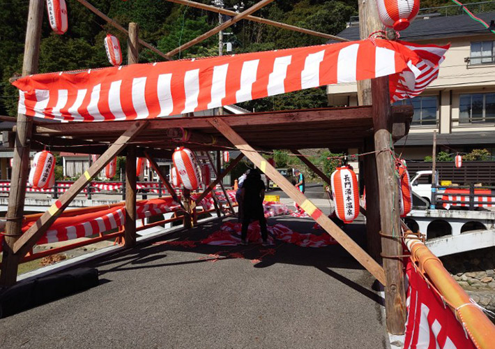 赤白カラーの9号長型ビニール提灯に、温泉名とロゴマークの名入れプリントを行いました。華やかな赤白提灯は青空にも夜空にも映え、お祭り提灯制作にぴったりな商品です!