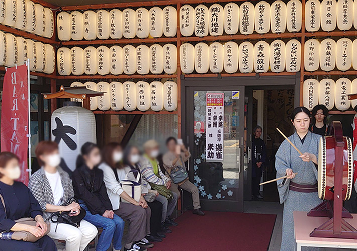 高さ約73cmほどの15号長型提灯に、職人の手書き名入れを施しました。大きなオリジナル提灯がしっかり存在感を発揮して、和風の雰囲気が一段とアップしています。