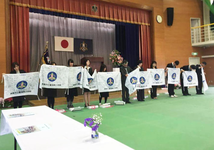 社旗と国旗は壁掛け装飾に、学校旗は三脚を使って掲揚し、入学式にご活用頂いております。3枚ともw1,050×h700mmサイズ、テトロンポンジ生地を使用いたしました。
