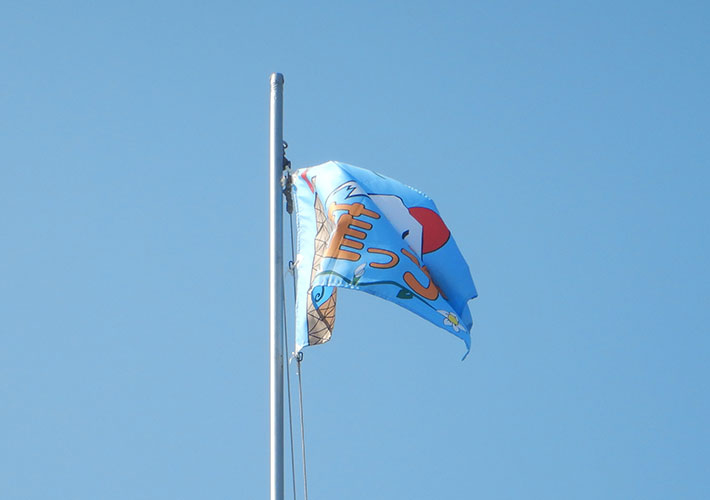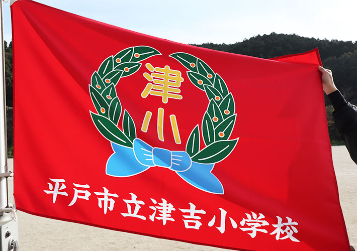 特注旗を小学校様のポールに掲揚して頂いております。厚手のテトロンツイル生地は高耐久で、両面印刷を施しているため裏面から見ても綺麗な仕上がりです。