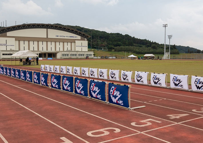 テトロントロピカル生地を使用し、2デザインの旗を制作しました。四隅に丈夫な挟みレザーハトメ加工を行い、陸上ハードルに取り付けてご活用頂いております!