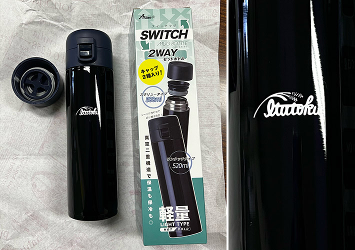 500mlの定番容量で使いやすく、光沢感のある格好いい本体に白の名入れを施しました。蓋の種類が2通りあり、ワンタッチタイプとスクリュータイプの付け替えが可能な便利なアイテムです!