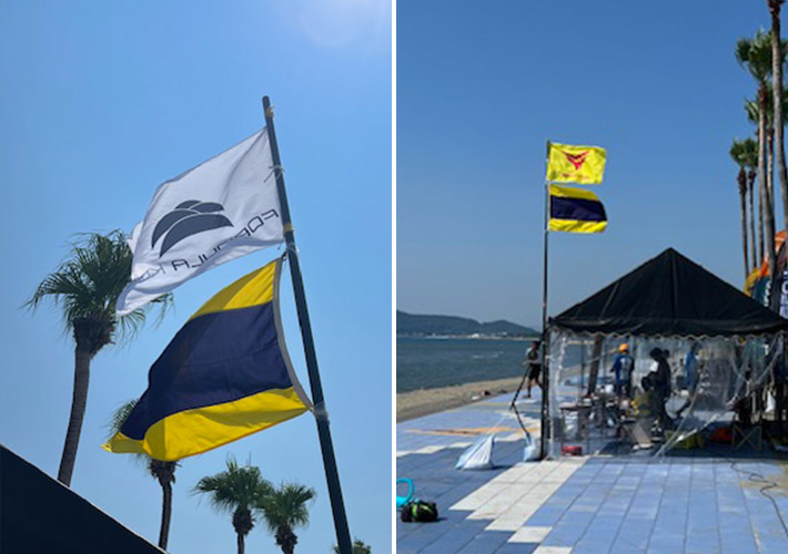 透けにくく丈夫な遮光ツイル生地を使用した団体旗は、ロゴのオリジナルデザインが透けず、尚且つ海風にも耐えられる様に補強しております。