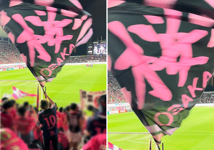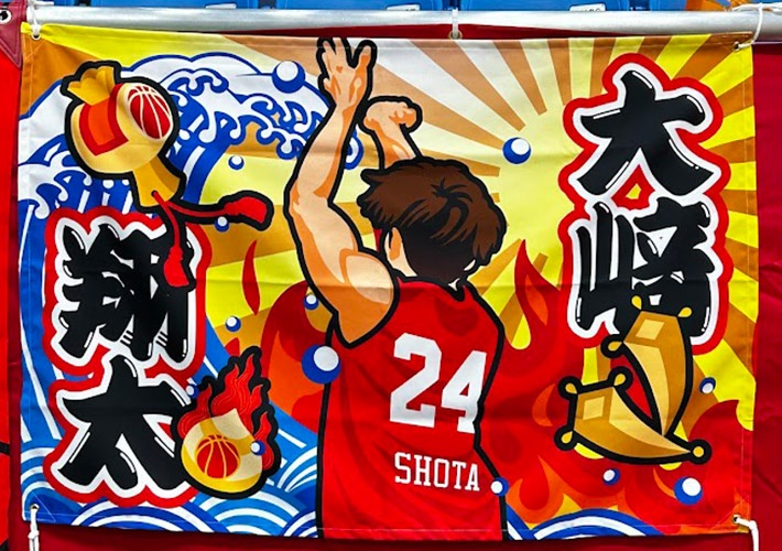 薄手で軽量なテトロンポンジ生地にフルカラー印刷を施し、w2,200×h2,000(mm)の応援旗を製作しました。観客席で黒地の旗がよく目立ち、大型サイズなので存在感も抜群です!