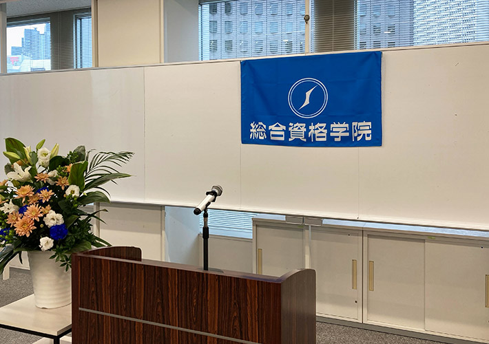 内定式の装飾として、青地に白いロゴ入れが爽やかな社旗を作成致しました!耐久性のある化繊生地を使用し、長くお使いいただく事も可能です。