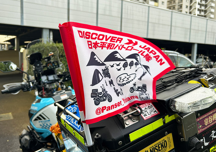 風によくなびく薄手の化繊生地を使用したオートバイを装飾するオリジナル手旗です。人気の小さめサイズにて作成いたしました!