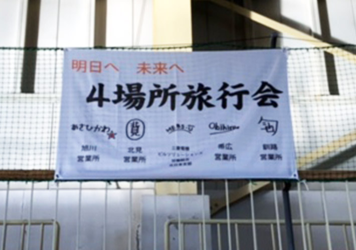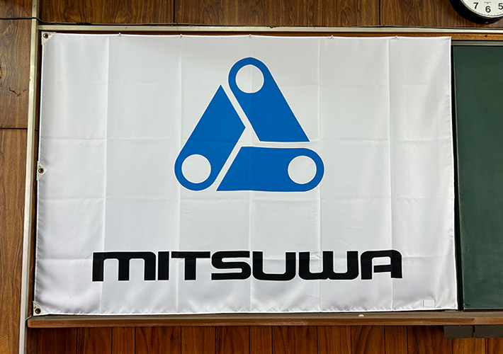 w1,000×h700mmサイズにて特注製作を行い、社内セレモニー装飾としてご活用頂きました。テトロンポンジ生地を使用し、格安かつ裏抜けのいい旗となっております。