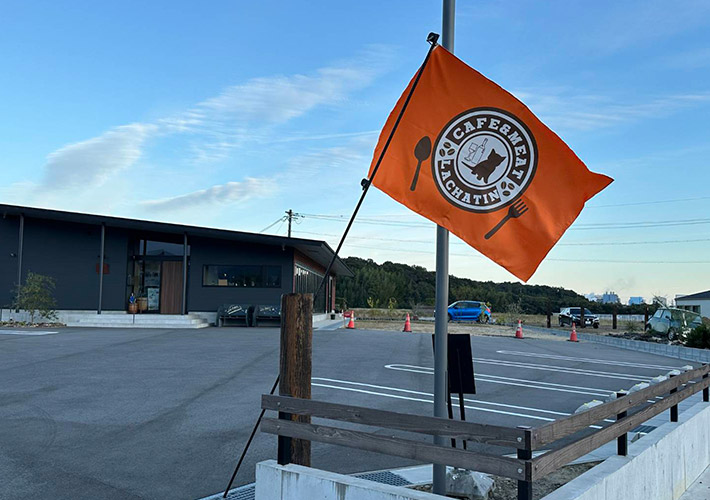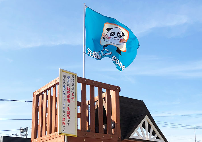 丸型のロゴをお皿に見立てた名入れデザインが可愛らしい特注旗です!通行人や車にも訴求できる大型サイズにて作成しております。